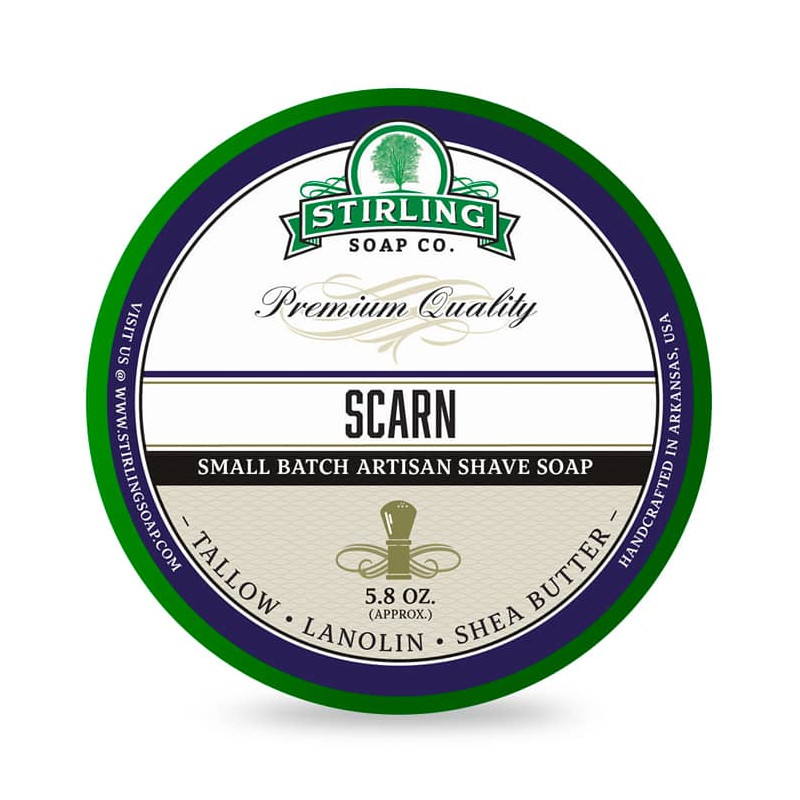 Rękodzielnicze, tradycyjne mydło do golenia Stirling Scarn na bazie łoju (Tallow) o specjalnej recepturze wzbogaconej lanoliną, roślinną gliceryną, olejkiem słodkich migdałów, mlekiem kokosowym i masłem Shea (Karite). Mydła Stirling w każdym zapachu wytwarzane są w niewielkich, limitowanych ilościach. Receptura mydła pozwala wytworzyć za pomocą pędzla do golenia pianę o niezrównanych właściwościach jeśli chodzi o jej gęstość, wydajność, efekt zmiękczenia zarostu i bardzo wysoki ślizg. Gęsta piana zapewnia poduszkę ochronną dla skóry podczas golenia oraz nawilża i odpowiednio odżywia skórę niezbędnymi emolientami, dzięki czemu skóra po goleniu jest elastyczna i zrelaksowana, z efektem super gładkości.