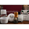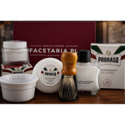 Pędzel do golenia z włosia borsuka w pięknym i wygodnym drewnianym uchwycie i kosmetyki Proraso dla cery wrażliwej oraz biała miseczka do golenia Omega.